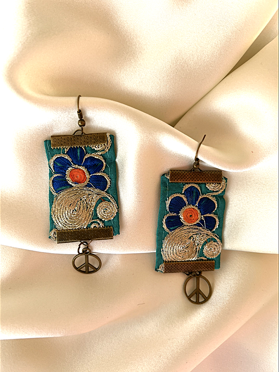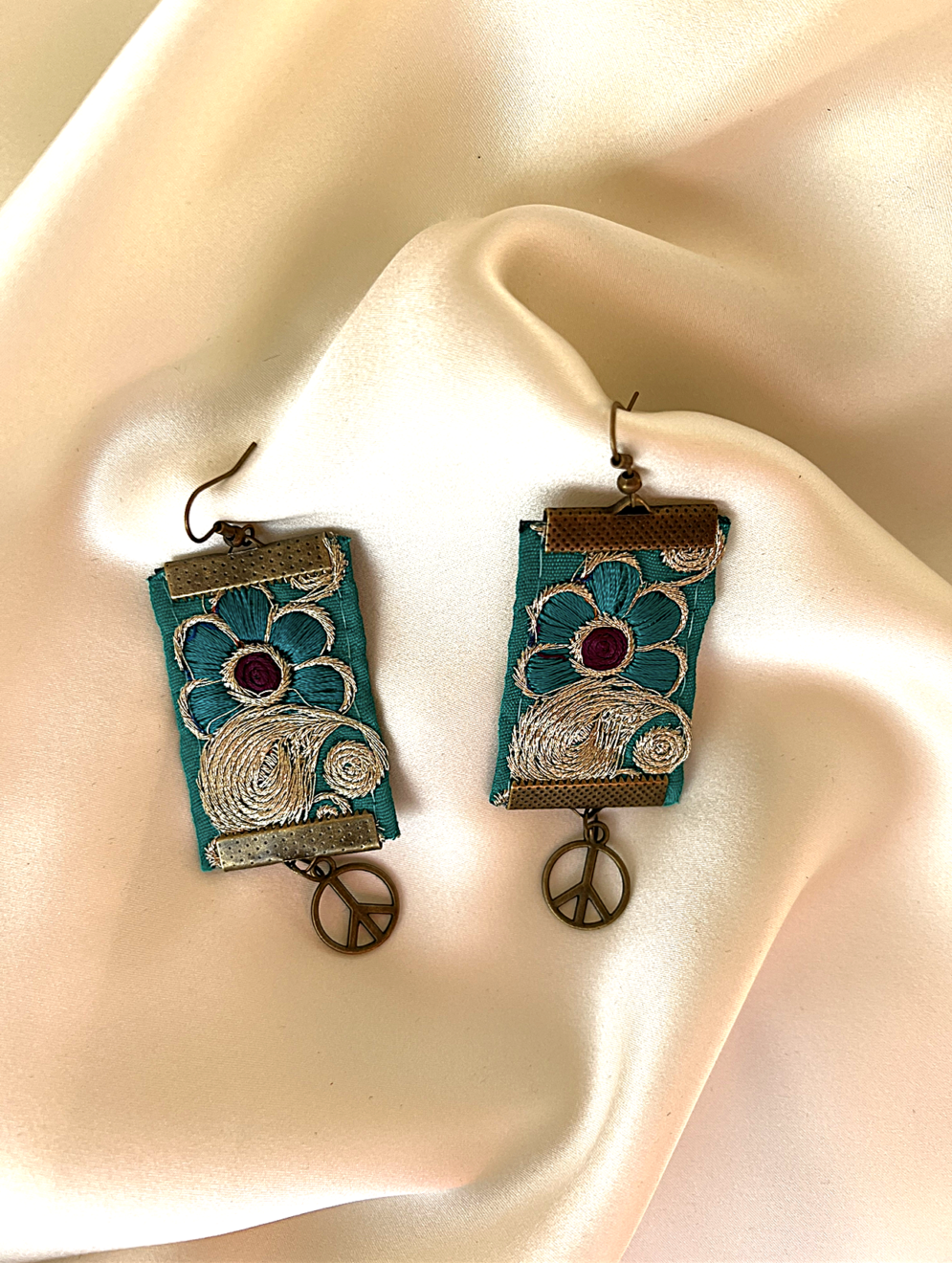 These handcrafted earrings feature a serene vertical composition, embroidered with flowing silver lines and a blooming floral motif at the top. The gentle curves echo growth and continuity, while the antique-brass framing and peace-sign charm add grounded meaning and soft movement. Calm yet expressive, the design reflects the enduring elegance of the cypress — standing tall, rooted, and alive.